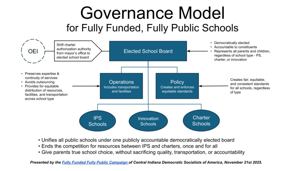 Public education is a public good. Full stop. It belongs to the people of Indianapolis and its families and communities; not to out of state billionaires, out of city ideologues, or city elites and private contractors. This is the model that parents, educators, and constituents have called for: one that preserves democratic elections and accountability, maximizes the efficient use of tax dollars putting more money directly into classrooms, prevents unnecessary disruption to students and their families, and allows for school choice, innovation, and universal, fair, and equitable standards. We call on the ILEA to adopt the principles stated here: a fully realizable vision for ending competition over resources in the most oppressed district of Indianapolis and building a unified, cooperative, and just fully public school system.